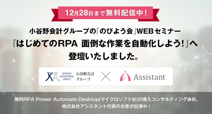 「【12/28まで無料配信中!】小谷野会計グループの「のびよう会」WEBセミナー『はじめてのRPA 面倒な作業を自動化しよう!』へ登壇いたしました。」を配信しました。